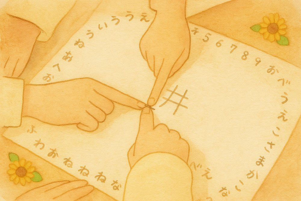 Resulta curioso que la Ouija europea tiene su equivalente en Japón, llamado Kokkuri-san. Los elementos son básicamente los mismos: una hoja de papel o tablero con todo el hiragana escrito, los números del 0 al 9 y las palabras «hai» (sí) e «iie» (no) y en la parte superior del centro, un torii.