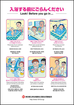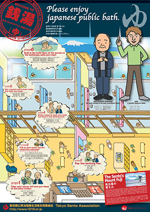 Los baños en Japón tienen dos fucniones, lo que es la función higiénica y la función social. Debido al carácter social, en los baños de cualquier tipo, hay un sitio con duchas y banquetas para lavarse propiamente con jabón y una vez con toda la espuma fuera y limpio es cuando vamos al estanque de agua caliente en sí. Es importante entrar limpio al agua del baño y sería una grave falta de educación entrar sucio o con espuma.